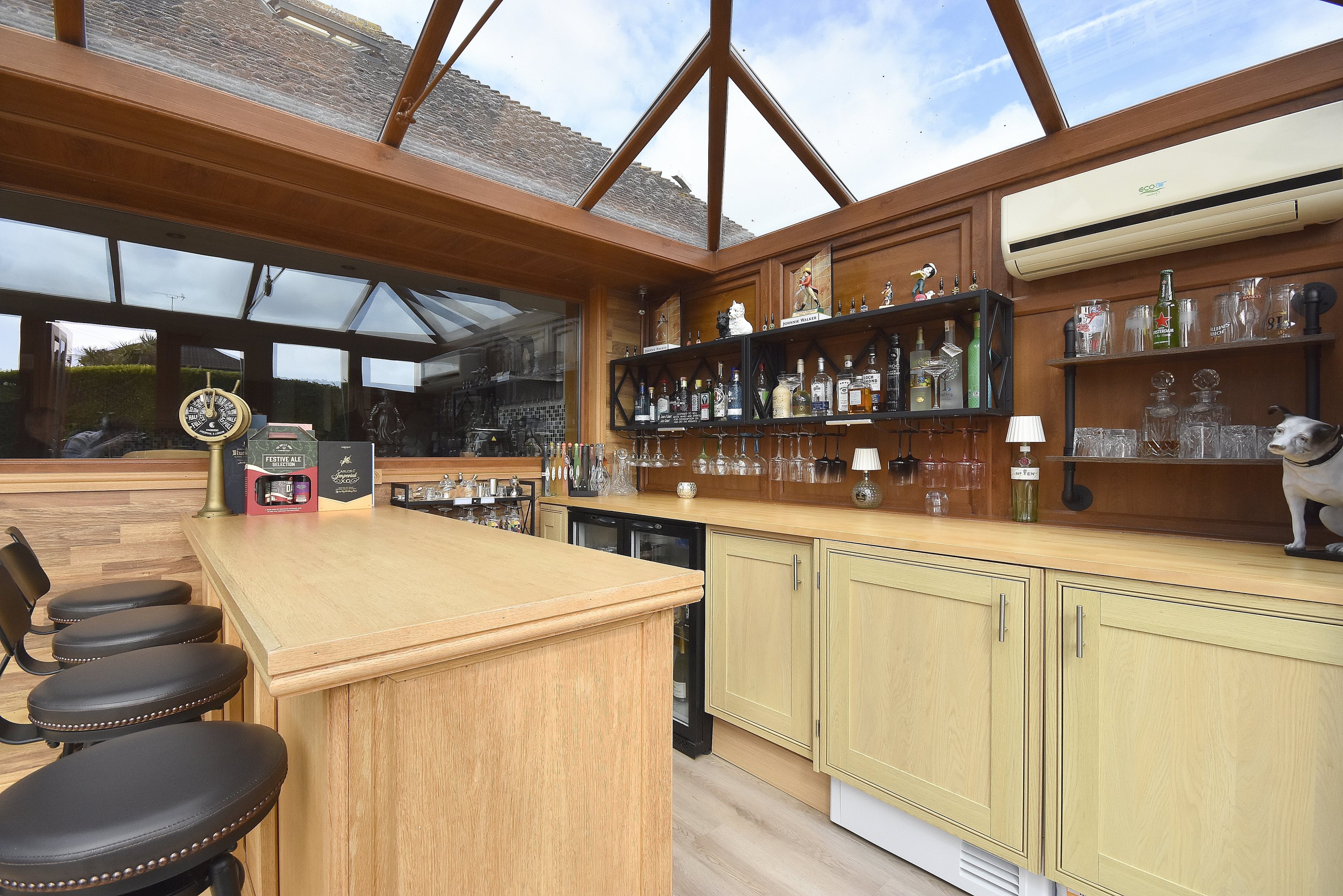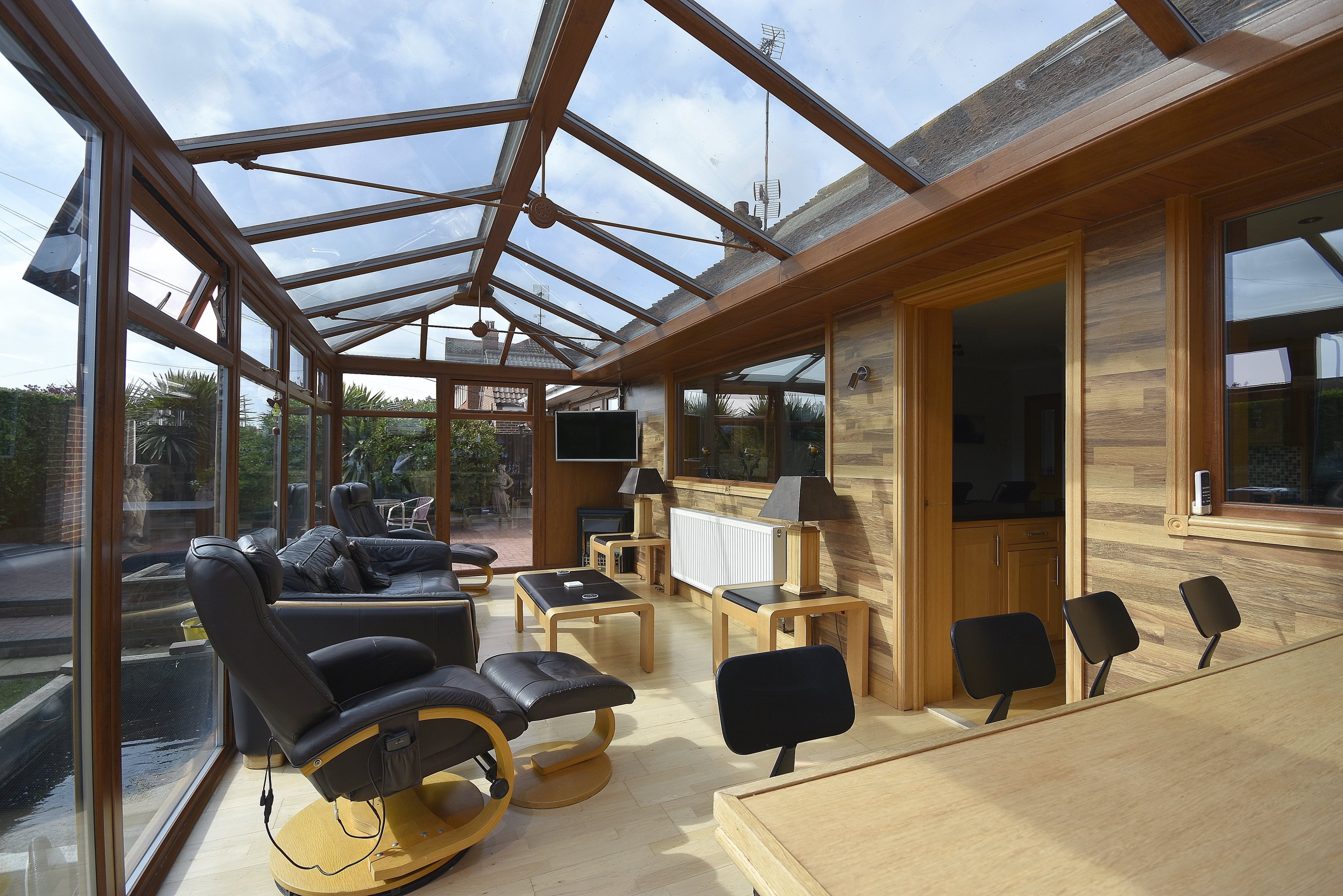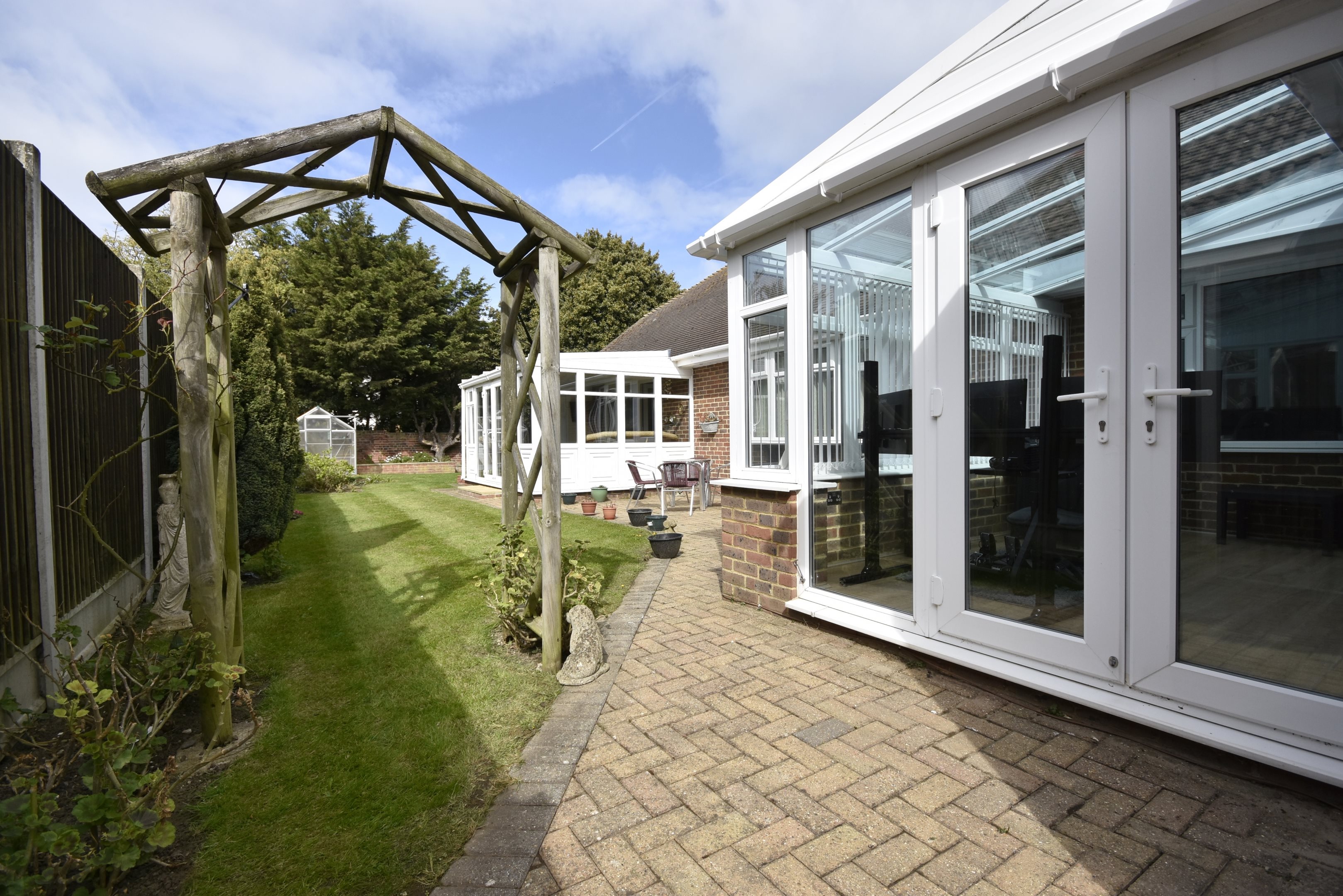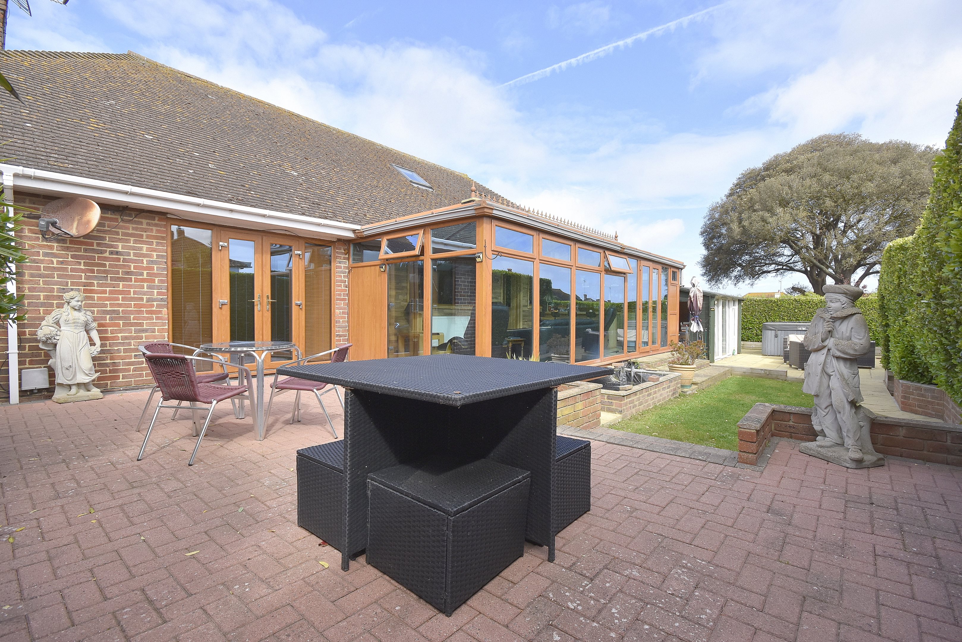 Entrance Hall26'6 x 9'9 narr to 5'5 (8.08m x 2.97m narr to 1.65m)Tiled floor. Radiator. Double storage cupboard. Stairs to first floor. Double doors to..Lounge16'1 x 15'1 (4.9m x 4.6m)Radiator. Power points. Double glazed window to side. Door to..Conservatory12'7 x 10'4 (3.84m x 3.15m)Double glazed windows to side and rear. Patio doors to garden. Power points.Kitchen/Diner24'7 x 12'9 (7.49m x 3.89m)Range of wall and base units with work surfaces. Rangemaster cooker. American style fridge/freezer. Space for wine fridge. Integral dishwasher. Breakfast bar. Large Cupboard housing wall mounted combi boiler. Door to cellar. Double glazed windows to side. Radiator. Door to..Conservatory26'5 x 9'6 (8.05m x 2.9m)Currently used as a bar. Radiator. Double glazed windows to side and rear. Double doors to garden. Integrated washing machine and tumble dryer.