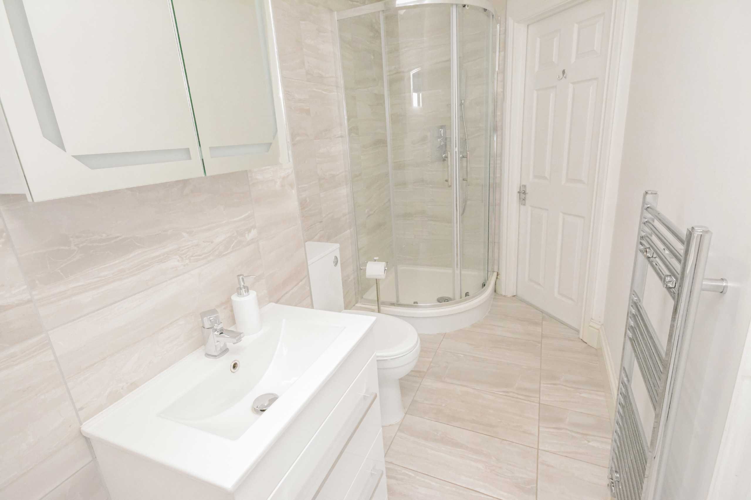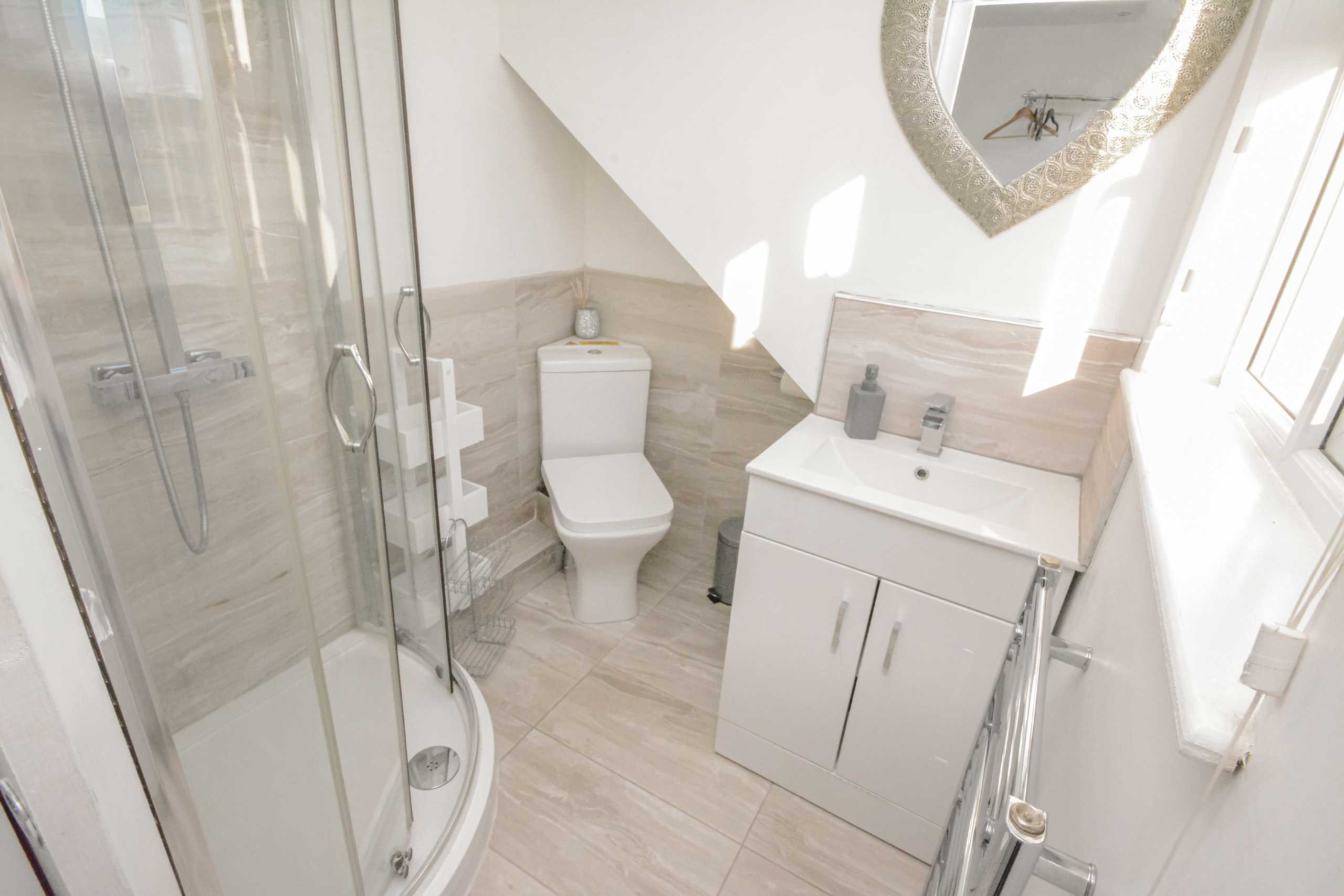 Shared and accessed via bedrooms 2 & 4. Suite comprising corner shower cubicle, vanity unit and low-level WC, towel rail